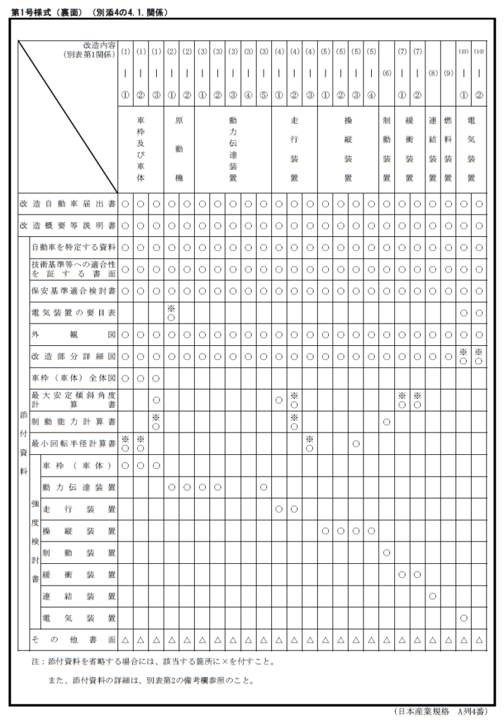 ここでは、審査事務規程に基づく「第1号様式(裏面)」をもとに、改造申請に必要となる添付資料について解説します。